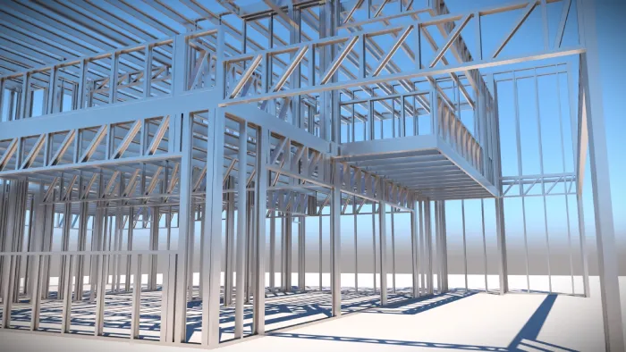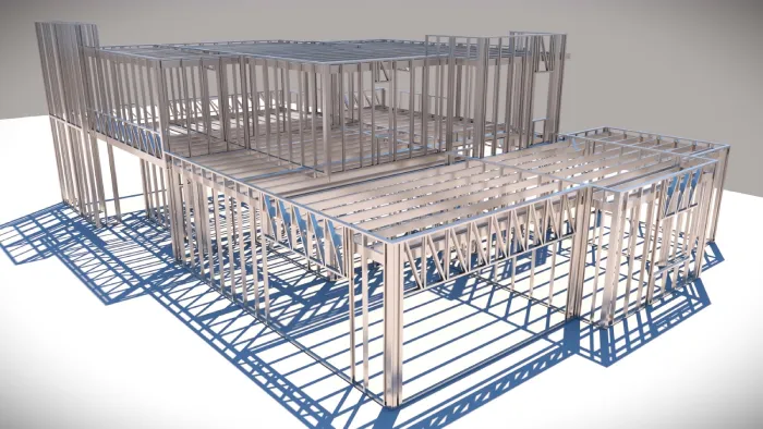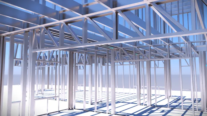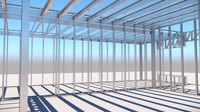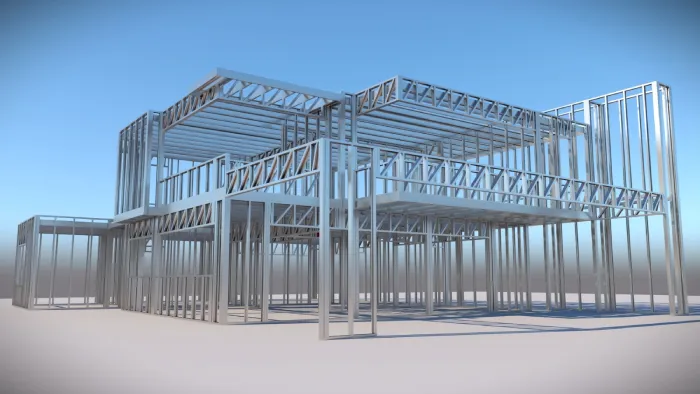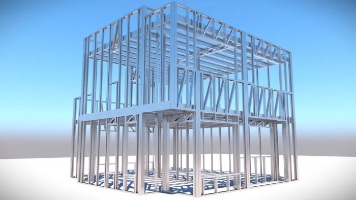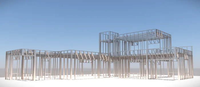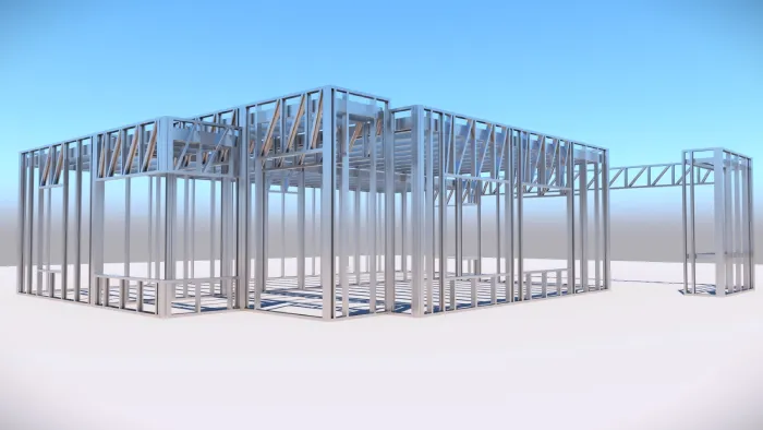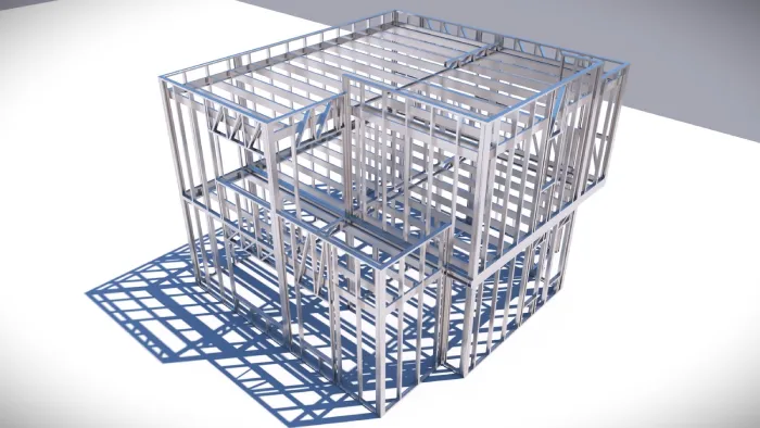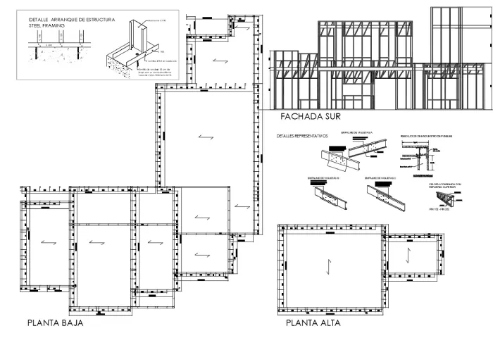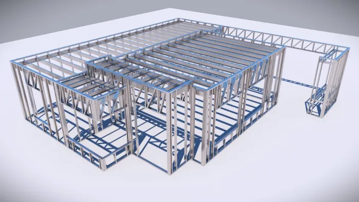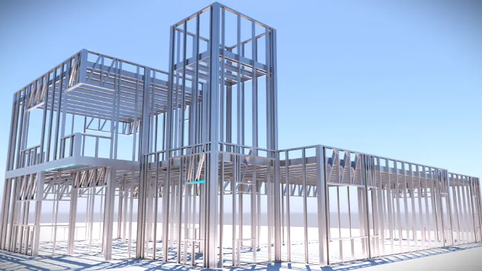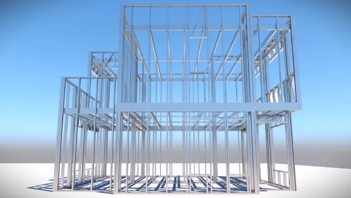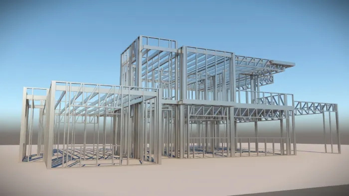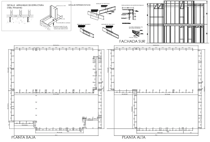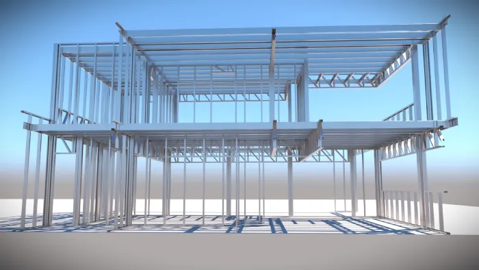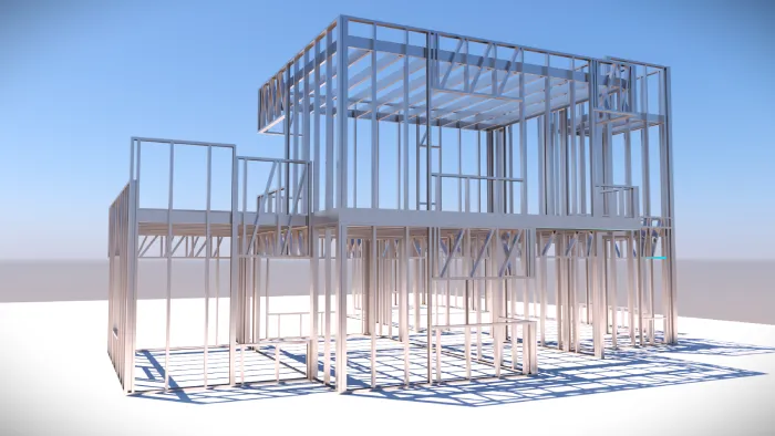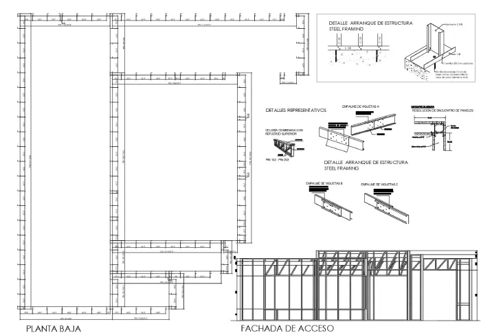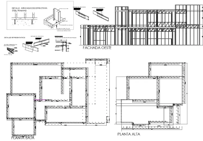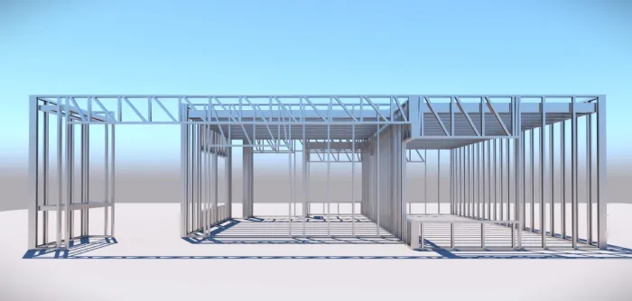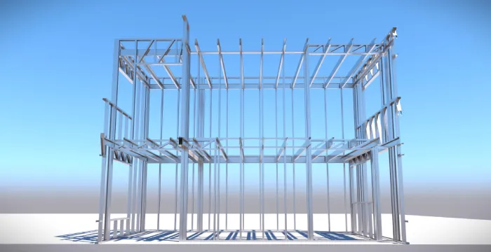 El cálculo estructural da como resultado una resolución con paneles interiores y exteriores con PGC 100*47*1.2mm en su totalidad, formando triangulaciones en dinteles y celosías que colaboran con la resistencia de los desplazamientos laterales. Tanto los forjados como las cubiertas fueron resueltas con PGC 200*47*1.2mm.